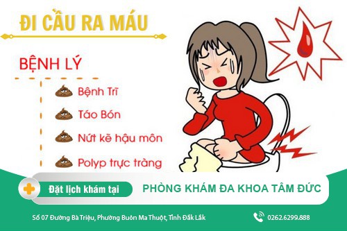 Hầu hết, đi cầu ra máu là dấu hiệu của các bệnh vùng hậu môn trực tràng. Hiện nay, Phòng khám đa khoa Tâm Đức (Số 07 Đường Bà Triệu, Phường Buôn Ma Thuột, Tỉnh Đắk Lắk) đã và đang áp dụng thành công các phương pháp trong việc điều trị: